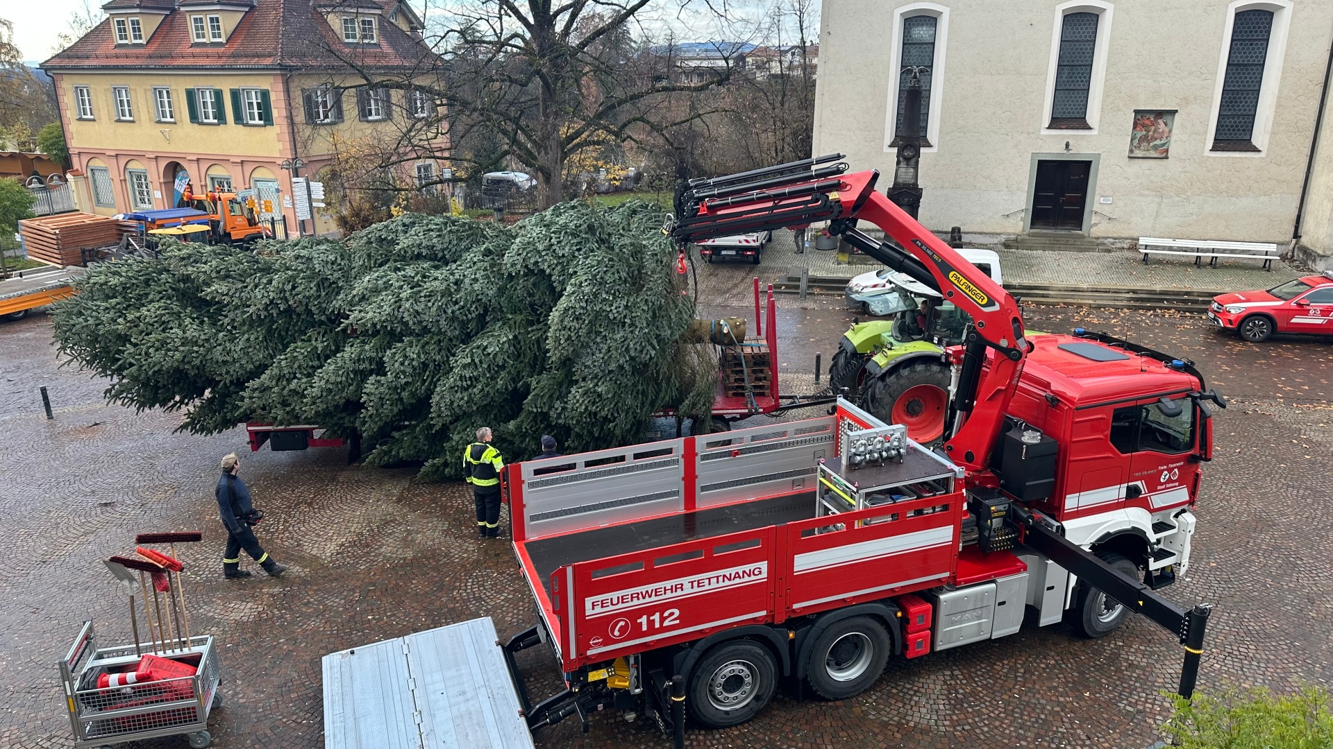 Baumkletterer, Feuerwehr und Bauhof bringen 17-Meter-Fichte sicher nach Tettnang