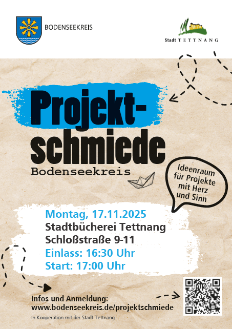 Die Stadt Tettnang und das Landratsamt Bodenseekreis laden herzlich zur Projektschmiede ein. In diesem kreativen Format treffen sich engagierte Menschen, um gemeinsam an gemeinnützigen Ideen und Projekten zu arbeiten. Ziel ist es, Initiativen voranzubringen, Lösungen für konkrete Herausforderungen zu entwickeln und neue Impulse für das Zusammenleben vor Ort zu schaffen.