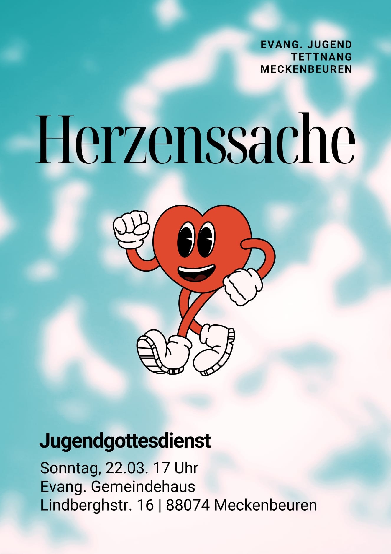 Die Evangelische Jugend Tettnang‑Meckenbeuren lädt herzlich zum Jugendgottesdienst unter dem Motto „Herzenssache“ ein. Der Gottesdienst findet am Sonntag, 22. März, um 17 Uhr im Evangelischen Gemeindehaus, Lindberghstraße 16, in Meckenbeuren statt. Im Anschluss an den Gottesdienst gibt es für alle Besucherinnen und Besucher noch etwas zu trinken und zu essen, mit Gelegenheit zum gemütlichen Zusammensein und Austausch.