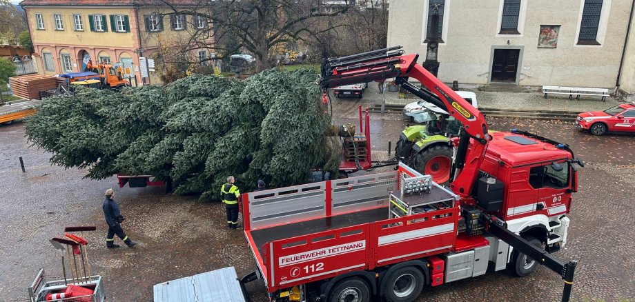 Vor dem Rathaus sorgten die Mitarbeitenden des Bauhofs für das präzise Aufrichten und Sichern des Baums. Inzwischen ist die Fichte fest verankert und vollständig beleuchtet – ein weithin sichtbares Zeichen dafür, dass der Advent in Tettnang Einzug gehalten hat.